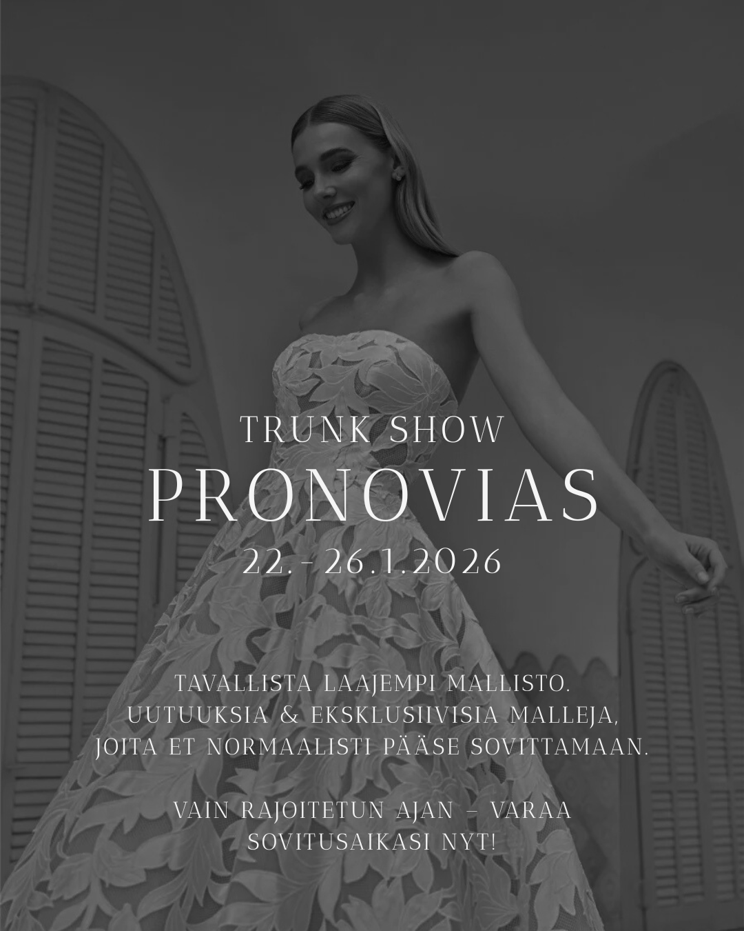 Tervetuloa 45 tai 90 minuutin hääpukusovitukseen! Odotamme innolla, että saamme auttaa sinua löytämään unelmiesi puvun!